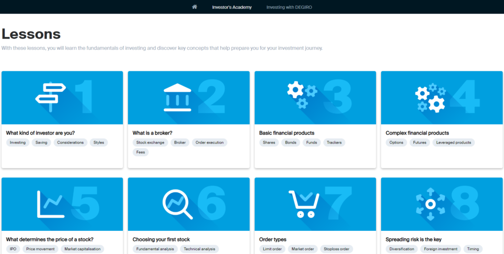 DEGIRO’s education materials can be found under the ‘Knowledge’ tab on their website. It has an ‘Investor’s Academy’ consisting of 10 fundamental lessons to kickstart your investor journey with texts and videos.