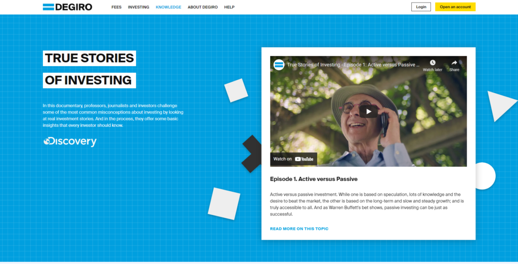 If you dig deeper, you will see a ‘Documentary’ menu. DEGIRO teamed up with Discovery to create a 4 part docuseries covering topics lice active versus passive investing, diversification, crises and bubbles and impact investments. They are of good quality, great starters for beginners.