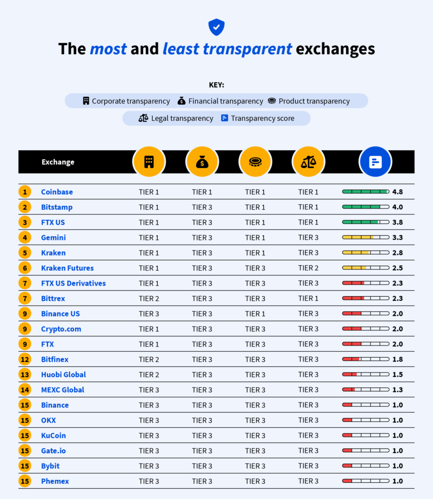 While it scored highly for each of the other pillars, FTX US Derivatives was somewhat let down when it comes to transparency, with a score of 2.3, offering little to no financial or legal transparency and complex products.