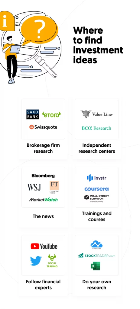 You can get inspiration from others’ ideas or you can do your own research. For example you could choose to buy into some stocks that Warren Buffett owns. On the other hand, if you put some time and energy into your own stock research, you can learn a lot more from it. Investment ideas can come from your broker in the form of stock reports and analyses, but you can also use independent research. The financial news and investment courses can also be useful in learning how to pick a winning stock and the suitable stock market.